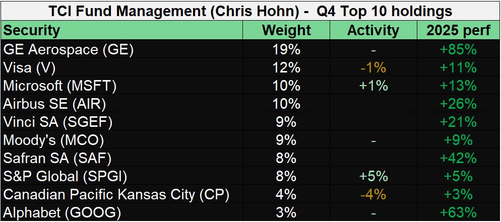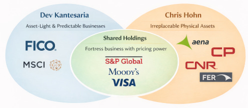 The portfolio is a live demonstration of Hohn’s playbook: aircraft engines (GE Aerospace and Safran), payments networks (Visa), enterprise software with switching costs (Microsoft), credit rating duopolies (Moody’s and SPGI), toll roads and airports (Ferrovial, Aena), and railroads (CP and CNR).