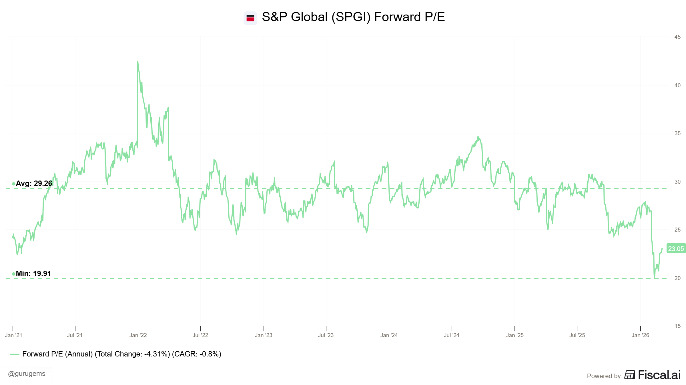 The current forward P/E of ~23x is the cheapest SPGI has looked on a forward basis in many years.