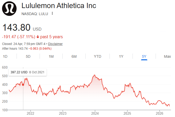 The stock is down ~58% from its 52-week high of $340 (June 2025), and ~32% year-to-date. The decline has been driven by slowing growth in the Americas, a Texas AG investigation around product chemicals, and most recently a sharp 13% drop on April 23 after the company appointed former Nike executive Heidi O’Neill as new CEO. The choice for O’Neill was a disappointment for activist investors Elliott Management.